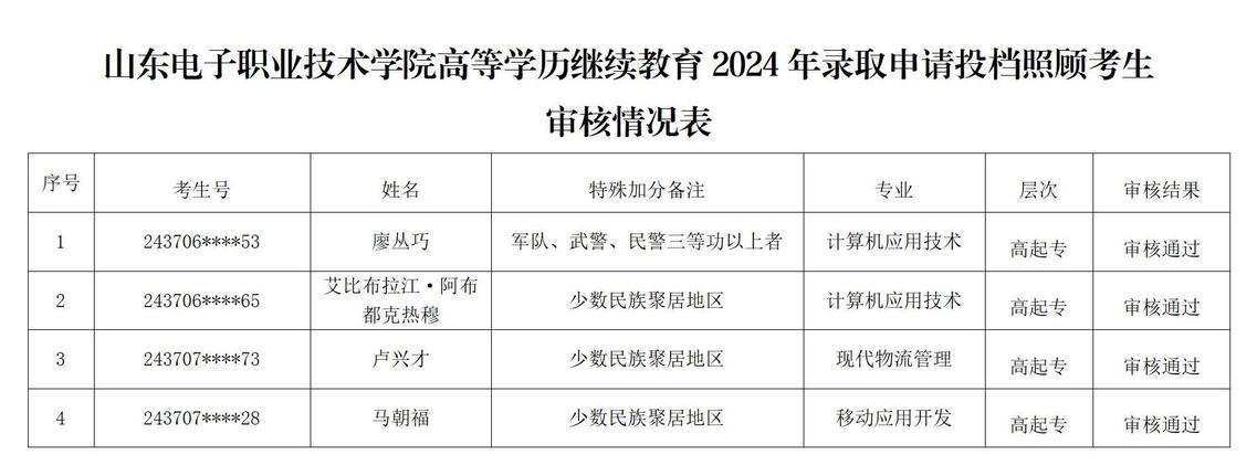 附件:山東電子職業(yè)技術(shù)學(xué)院高等學(xué)歷繼續(xù)教育2024年錄取申請投檔照顧考生審核情況表