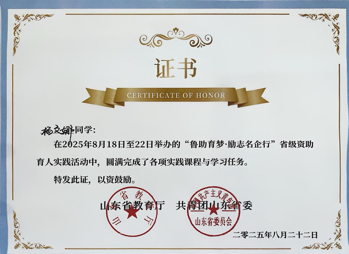 8月18日至8月22日,由山東省教育廳、團省委聯(lián)合發(fā)起的2025年“魯助育夢·勵志名企行”省級資助育人實踐活動在歷經(jīng)5天的精彩行程后圓滿落幕。全省高校近200名學(xué)生代表共同參與,我校選派楊文娜、趙現(xiàn)敏兩名優(yōu)秀學(xué)生代表全程參與,圓滿完成各項實踐學(xué)習(xí)任務(wù)。