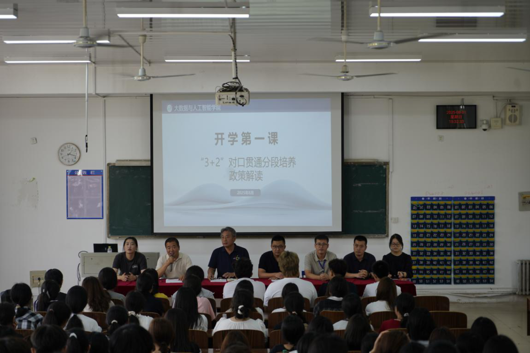 新生入學(xué)當(dāng)天下午,大數(shù)據(jù)與人工智能學(xué)院院長(zhǎng)劉學(xué)、團(tuán)總支書記李海彬帶領(lǐng)輔導(dǎo)員走訪宿舍,與新生親切交流生活狀況,勉勵(lì)其夯實(shí)專業(yè)基礎(chǔ)、參與科研競(jìng)賽,同時(shí)叮囑宿舍安全與合理作息,讓新生倍感關(guān)懷、對(duì)大學(xué)生活更有信心。8月31日,學(xué)院召開“3+2”對(duì)口貫通分段培養(yǎng)政策解讀大會(huì),招就處副處長(zhǎng)李棟介紹項(xiàng)目招生情況并強(qiáng)調(diào)學(xué)院轉(zhuǎn)段率居全省前列,劉院長(zhǎng)解讀轉(zhuǎn)段考核三大核心環(huán)節(jié)且期望班級(jí)實(shí)現(xiàn)100%轉(zhuǎn)段率,李書記鼓勵(lì)新生以轉(zhuǎn)段成功為目標(biāo)規(guī)劃學(xué)習(xí)路徑,會(huì)后新生對(duì)政策理解更深、明確努力方向。9月1日,學(xué)院舉辦新生入學(xué)教育大會(huì),劉院長(zhǎng)介紹學(xué)校情況,王紅寄語(yǔ)新生嚴(yán)守紀(jì)律、拼搏奮斗,教師代表王蒙解析專業(yè)前沿趨勢(shì),2024級(jí)學(xué)生代表分享經(jīng)驗(yàn),新生代表表達(dá)對(duì)大學(xué)生活的期待。系列活動(dòng)拉近師生距離,彰顯學(xué)院“以生為本”的育人理念,為新生開啟大學(xué)生活、明確目標(biāo)提供助力,也為學(xué)院培養(yǎng)高素質(zhì)人才奠定基礎(chǔ)。